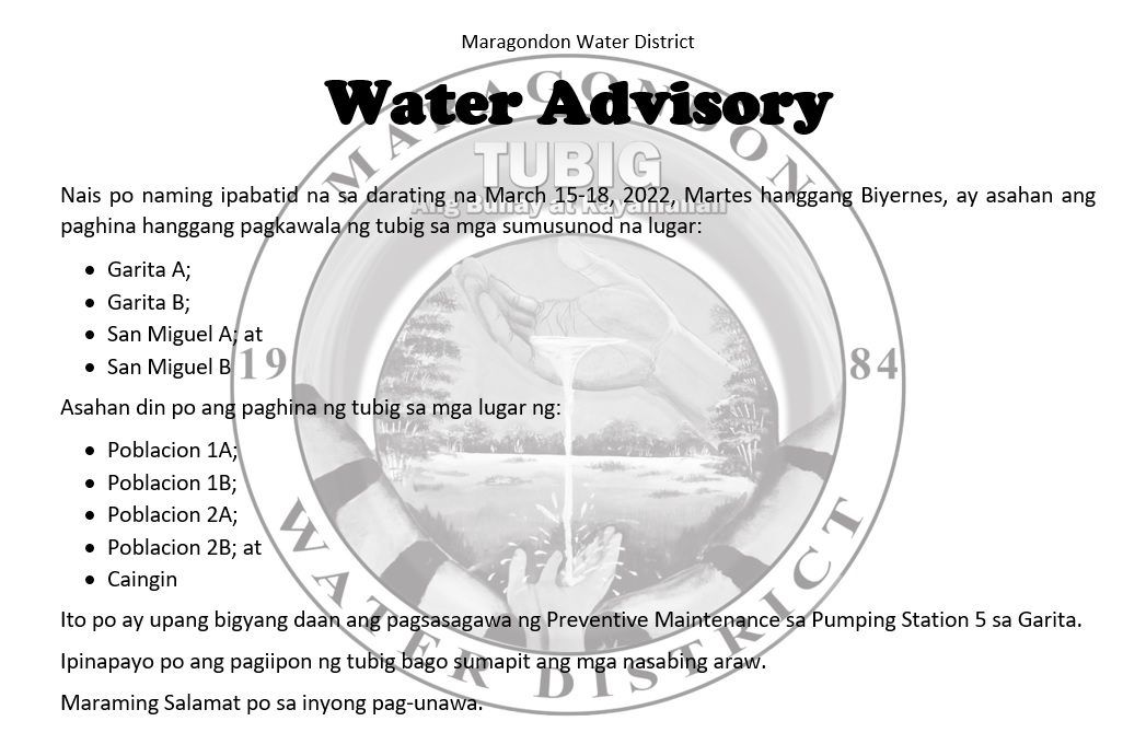 Concessionaires of Maragondon Water District are advised that due to Typhoon Dante, the Province of Cavite is under storm signal #2 and this may result in power interruptions that would cause the interruption of water supply.