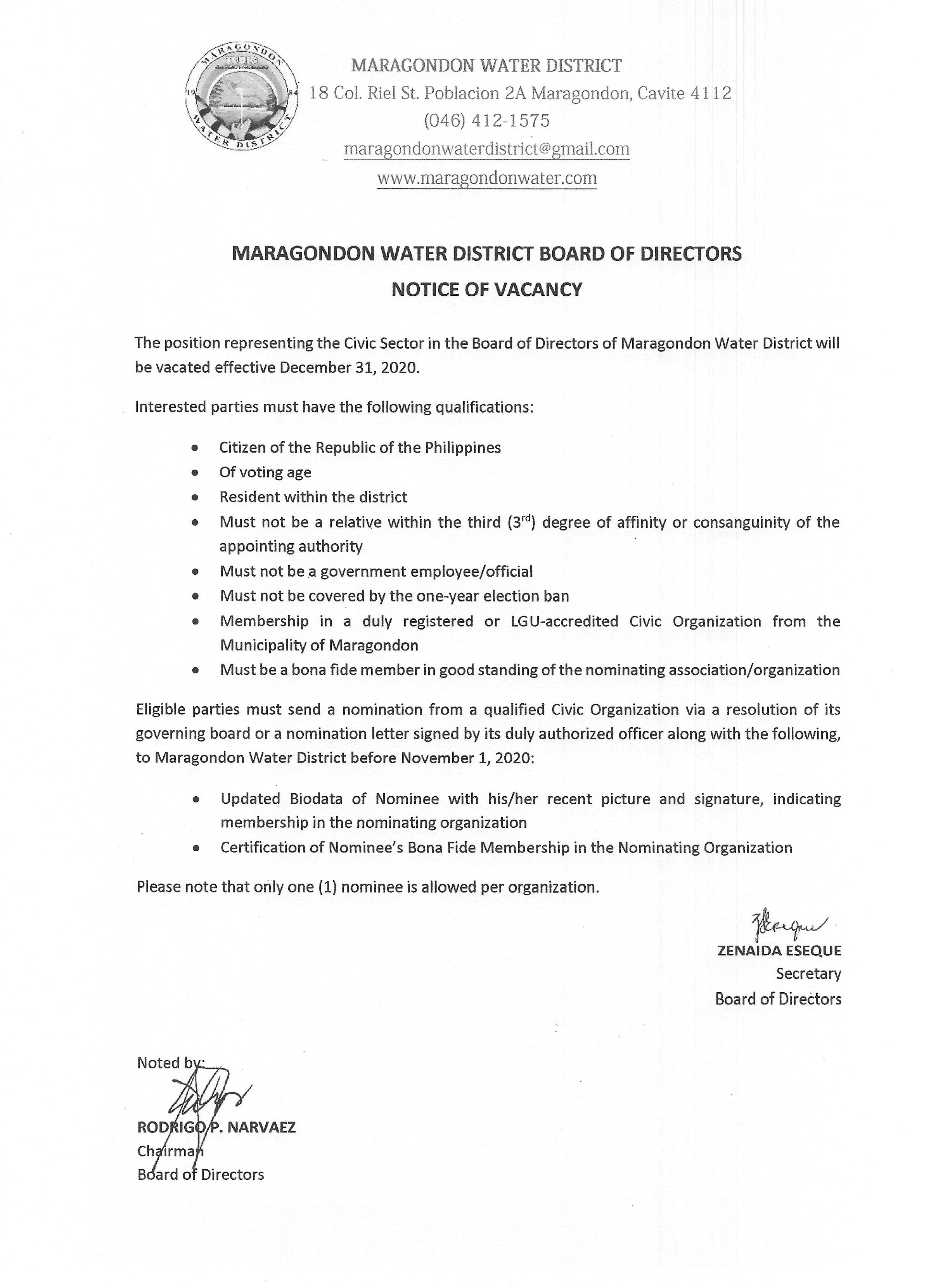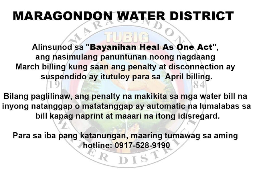 Due to this issue, low pressure or service interruptions can be expected in the service areas of Maragondon Water District.